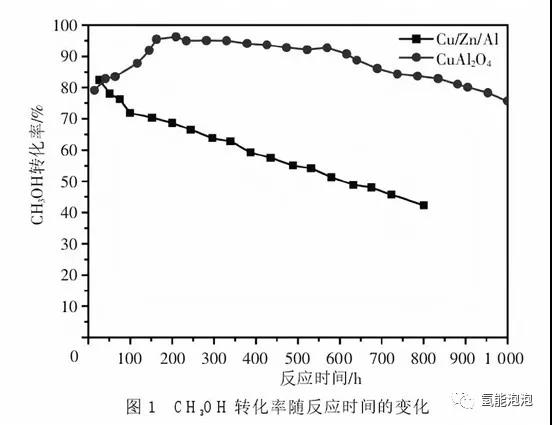 该技术的核心是设计制备新型缓释催化材料,使其具有不同的还原性能?;诖思际?,以CuAl2O4作为催化剂,大幅提高了铜基催化剂的性能,如图1所示。由图1可知,与工业Cu/Zn/Al催化剂相比,CuAl2O4催化剂通过缓释催化技术,催化活性和稳定性均得到了大幅度提高。