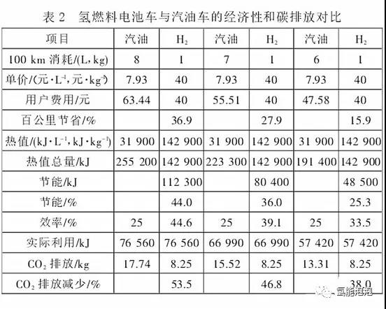 在能量消耗方面,根据汽油和H2的热值,可获得不同燃油消耗的汽车与氢燃料电池车百公里消耗的热值总量,具体见表2。