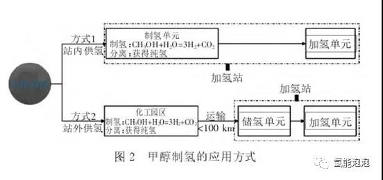 基于甲醇制氢技术的特点,可在站内制氢,现制现用,无需H2的大量运输和存贮,也可在化工园区集中制氢,再通过短距离运输(<100km)至加氢站,两种应用方式都具有切实的可行性。
