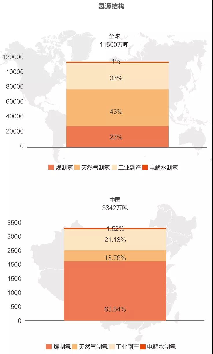 目前,全球氢能产量中,有23%是煤制氢,43%是天然气制氢,33%是工业副产品制氢。这些大多属于灰氢,部分属于蓝氢。而中国更是有超过60%的氢来自于完全属于灰氢的煤制氢。