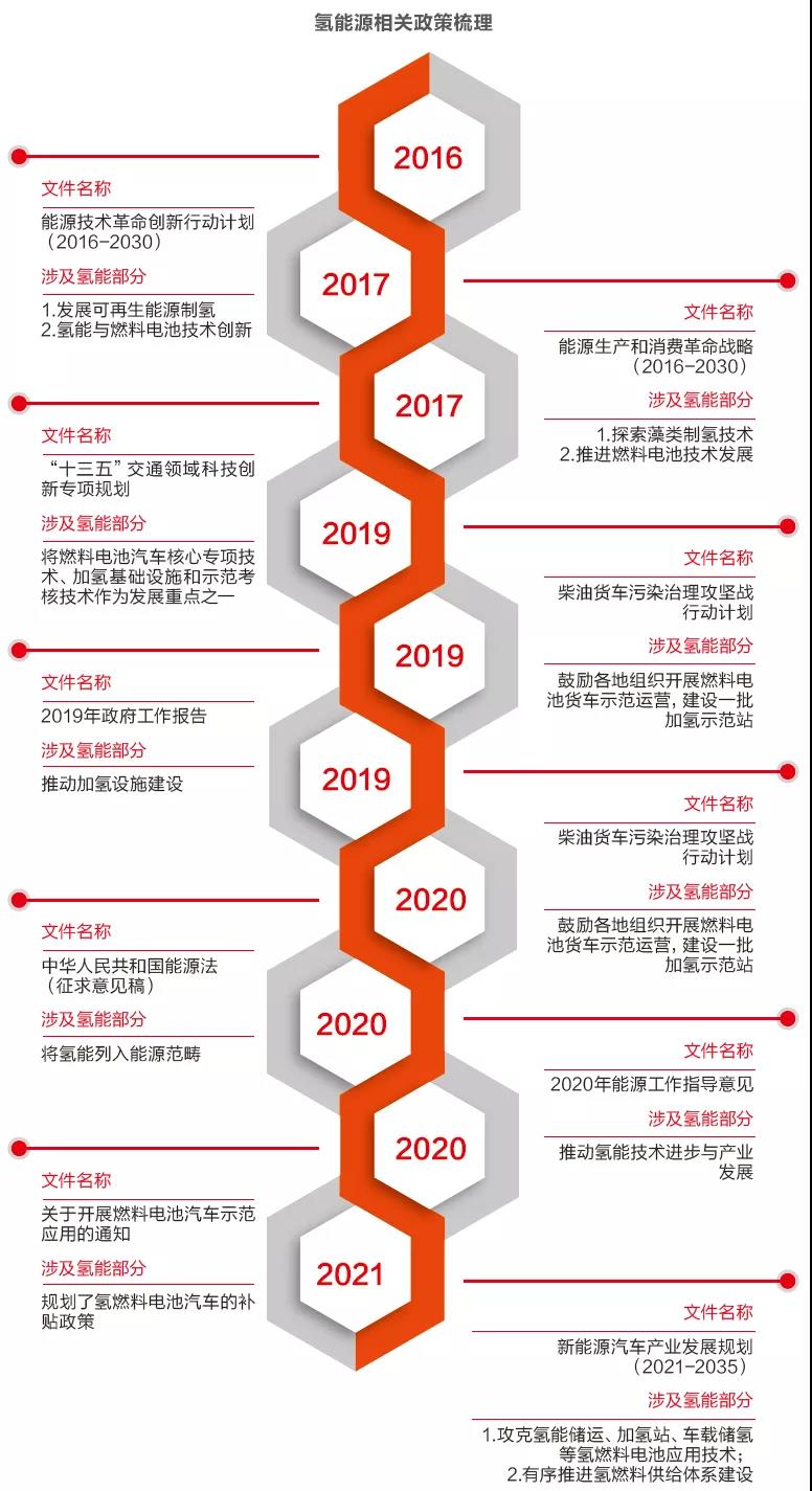 从“十三五”时期开始,氢能在国内的发展开始逐渐有了商业化的突破。产业链开始初具雏形,这侧面反映在国家政策对于氢能的支持力度开始增大。