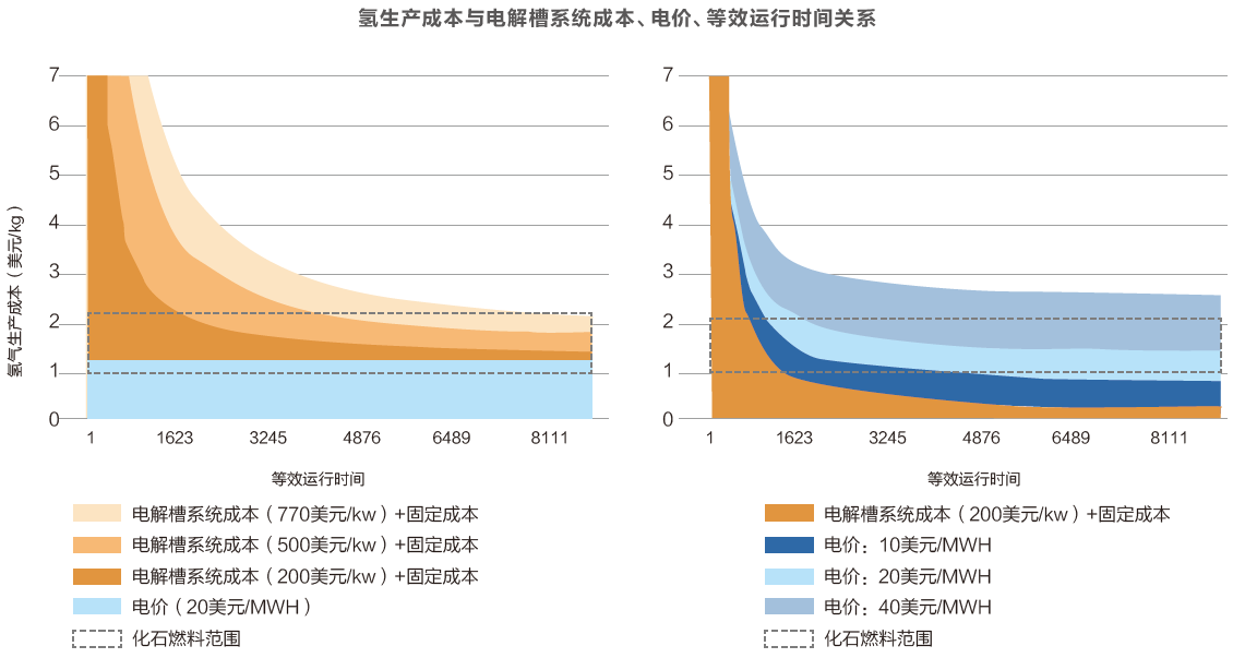 所以实际上绿氢的制造成本必须要综合考虑电解槽成本、电价和运行时间三个重要的因素。