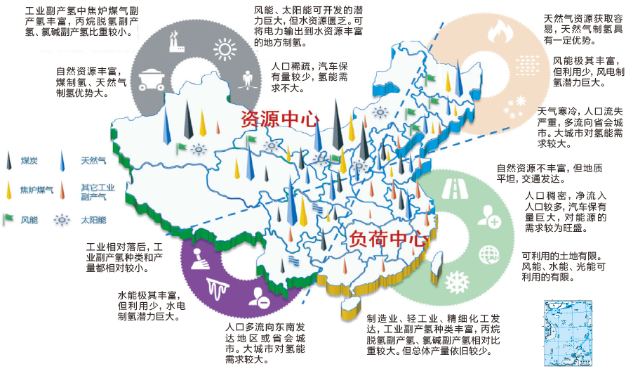 但是中国风资源、光资源和水电资源分布都呈现出极强的地域特征。西北地区风光资源丰富且开发潜力巨大,但水资源相对较少。西南地区水资源和水电资源都十分丰富,看起来适合发展电解水。但西南地区经济发展程度较低,人口密度相对较少。缺乏广泛的氢能应用市场。东南沿海地区海上风电资源、水源充足,并且工业门类齐全、城市密集,同时具备绿氢的制造和应用潜力。