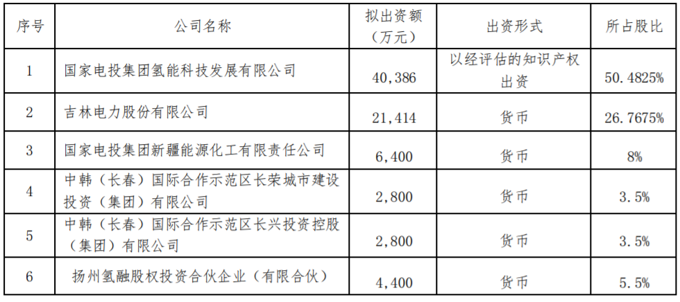 吉电股份11月9日公告显示,为推进氢能业务发展、打造吉林省氢能产业基地,公司拟与国家电投集团氢能科技发展有限公司、国家电投集团新疆能源化工有限责任公司、中韩(长春)国际合作示范区长荣城市建设投资(集团)有限公司、中韩(长春)国际合作示范区长兴投资控股(集团)有限公司、扬州氢融股权投资合伙企业(有限合伙)和扬州氢和股权投资合伙企业(有限合伙)共同成立合资公司长春绿动氢能科技有限公司,开展质子交换膜水电解先进制氢设备研发、制造。