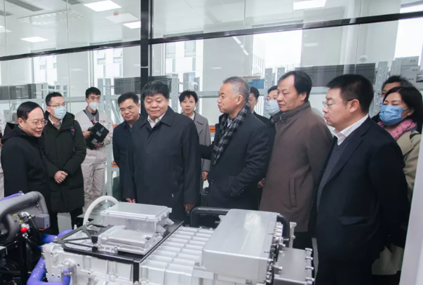 会后,与会人员参观了中车氢能产业园,驻足观看了电堆和系统组装线、电堆和系统试验室、储氢试验室等氢能动力系统关键产线,以及中运量列车燃料电池系统样机,并就技术研发和市场应用场景进行了了解和指导。