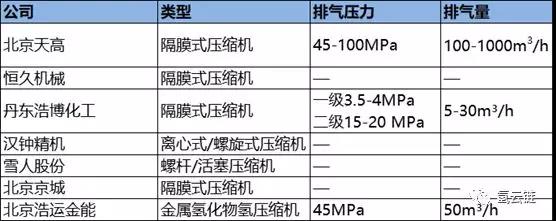 国内企业具备金属隔膜压缩机的量产能力(见表4)。北京天高两次承担国家“863”氢能项目,产品排气压力最高100MPa,排气量可达1000m3/h。由于金属隔膜压缩机的寿命由频繁启动次数决定,为了解决高频启动、大规模加氢的需求,日本和美国已经开始使用高纯无油压缩机(气体增压器形式),特别是日本经过十多年应用已经大规模使用。