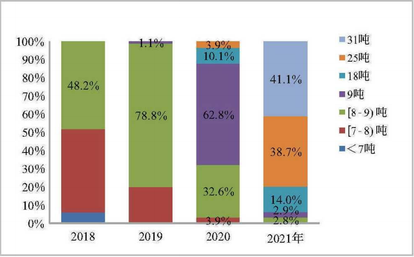 图3 近年我国燃料电池专用车车型吨位结构走势