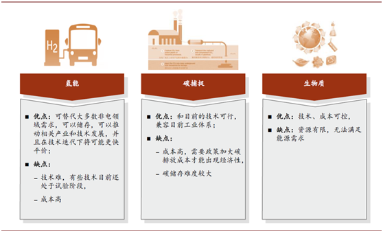 实现碳中和必须在非电领域推动新的技术发展和应用,目前来看主要有三个解决方案,分别是氢能源、碳捕捉和生物质。但是考虑到生物质资源上的限制,以及碳捕捉对于政策要求,氢能在产业发展,技术迭代上优势更强,在逐步解决安全性、经济性、技术工艺成熟度过程中,更有可能是最好的解决方案。