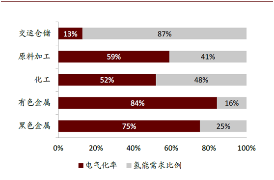 几个主要板块的电气化率预期以及预期氢能需求贡献比例(2060年)