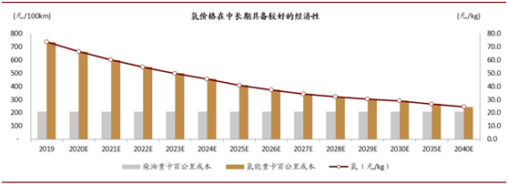 不考虑燃油综合使用成本提升下,重卡领域氢价格低于20元/kg将具备与柴油的直接平价能力