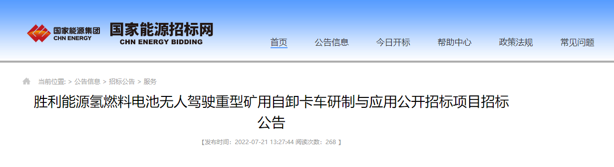7月21日,神华北电胜利能源有限公司发布了氢燃料电池无人驾驶重型矿用自卸卡车研制与应用项目招标公告。神华北电胜利能源有限公司为中国神华能源股份有限公司控股子公司。