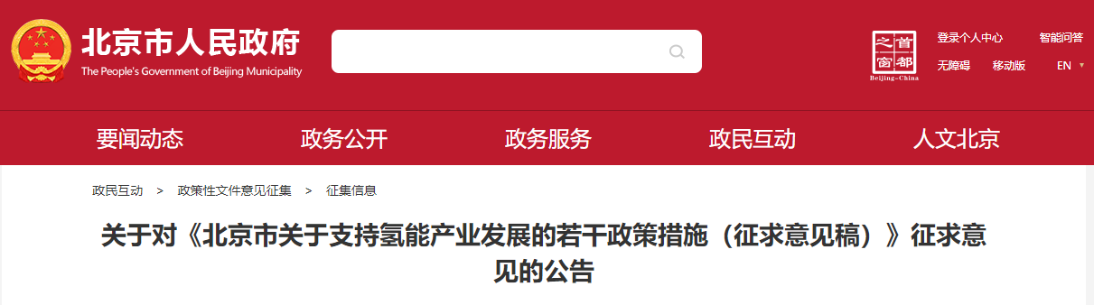 关于对《北京市关于支持氢能产业发展的若干政策措施(征求意见稿)》征求意见的公告