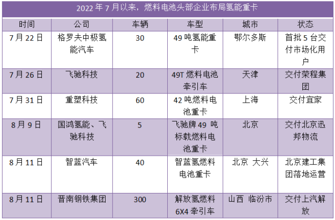 7月以来,燃料电池头部企业正在加快氢能重卡的商业化落地步伐,北京、山西、天津、鄂尔多斯等多地纷纷传出氢能重卡批量交付的消息: