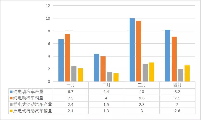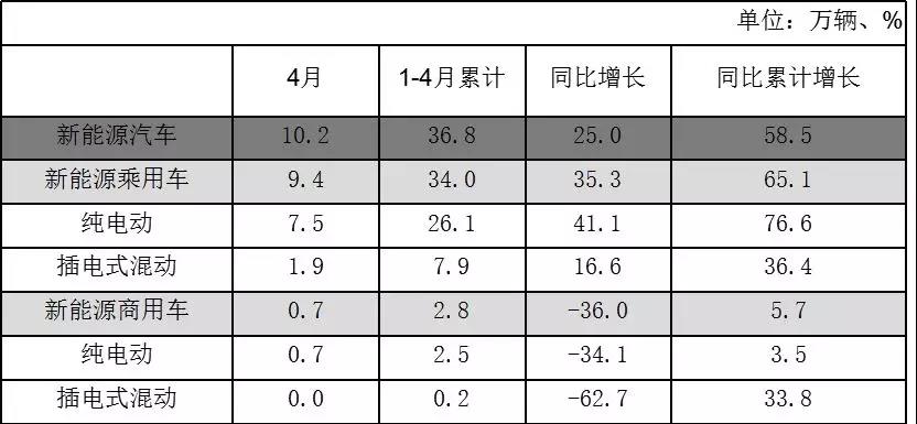 其中新能源汽车方面,2019年4月,新能源汽车产销分别完成10.2万辆和9.7万辆,比上年同期分别增长25.0%和18.1%。其中纯电动汽车产销分别完成8.2万辆和7.1万辆,比上年同期分别增长28.2%和9.6%;插电式混合动力汽车产销分别完成2.0万辆和2.6万辆,比上年同期分别增长13.6%和50.9%;燃料电池汽车产销分别完成9辆和7辆,比上年同期分别下降84.5%和87.5%。