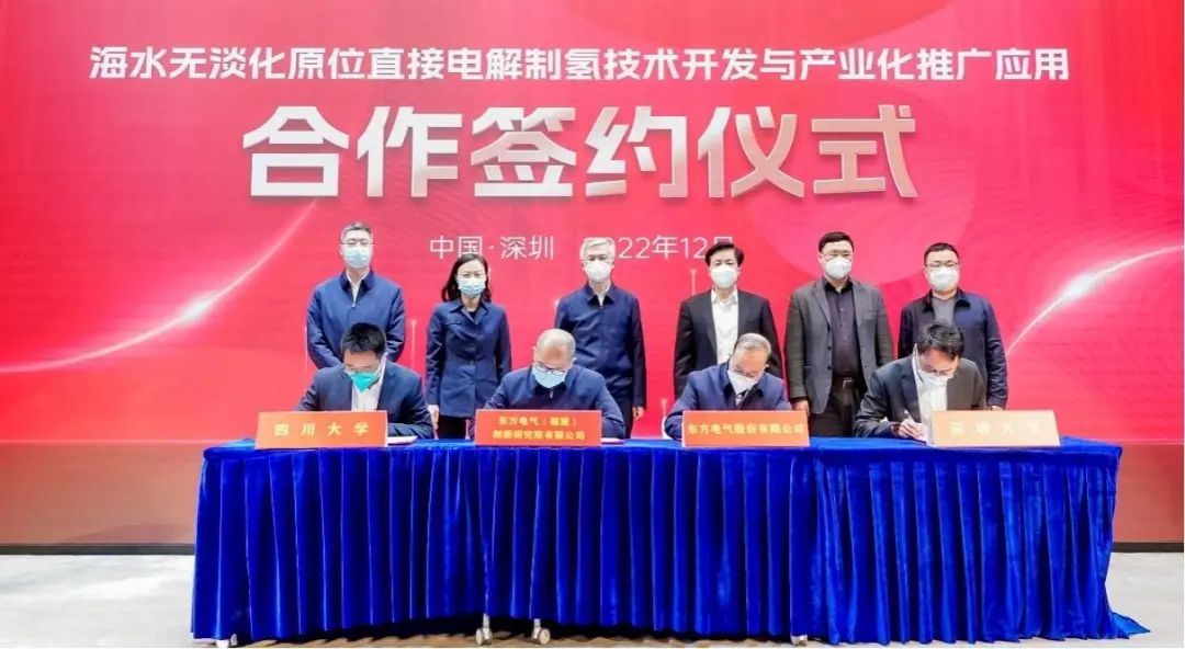12月16日,深圳大学/四川大学谢和平院士团队与东方电气股份有限公司、东方电气(福建)创新研究院有限公司签署“海水无淡化原位直接电解制氢原创技术中试和产业化推广应用”的四方合作协议。