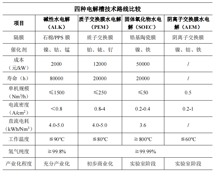 根据电解质的不同,目前电解水制氢有碱性水电解(ALK)、质子交换膜水电解(PEM)、固体氧化物水电解(SOEC)和阴离子交换膜水电解(AEM)四种技术路线,各有优缺点,ALK处于产业化阶段、PEM处于初步商业化阶段、SOEC和AEM处于实验室阶段。