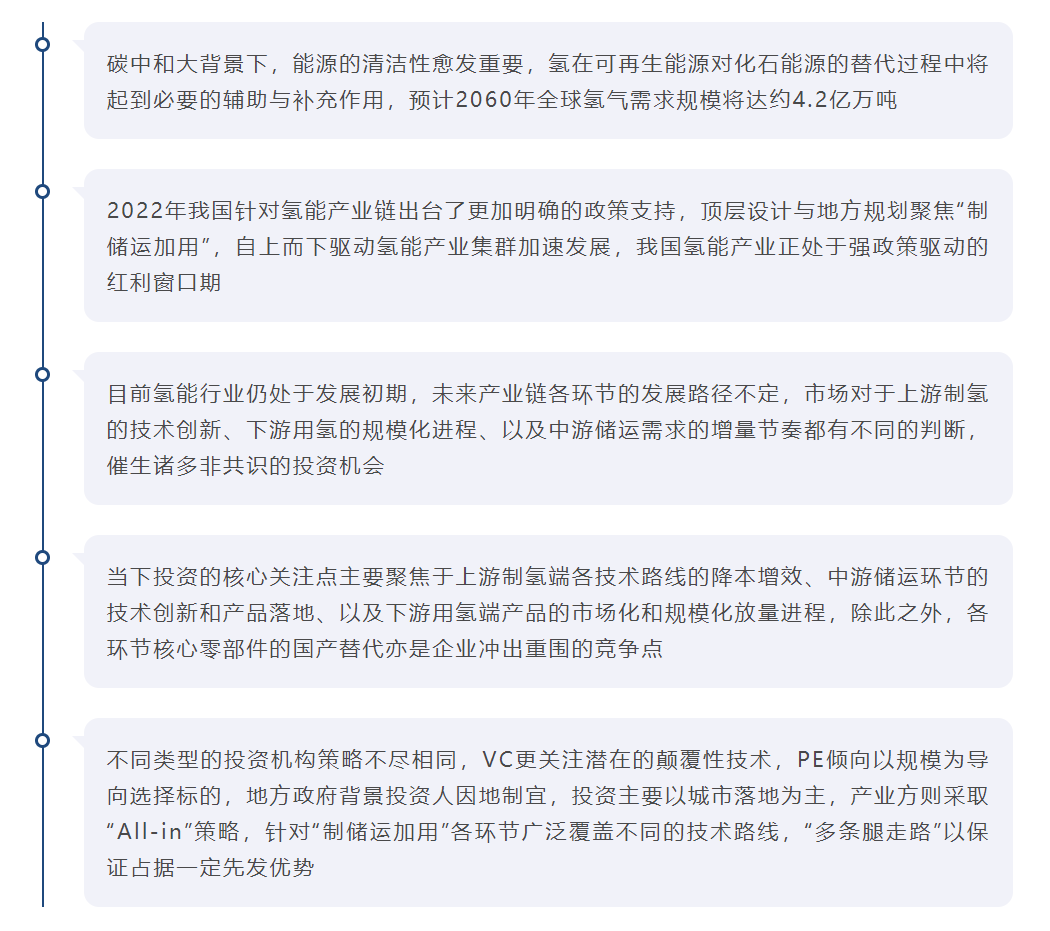 投资人普遍认为在政策风口愈吹愈劲、能源安全重要性逐渐凸显的驱动下,氢能将会是终极路线之一,形成一个万亿级、有潜力催生多家上市企业的庞大赛道,赛道未来发展的确定性较强。但目前整个行业尚处于起步阶段,投资机构对于入局的时间点缺乏共识,部分机构已经开始积极布局,部分机构暂时持观望态度。