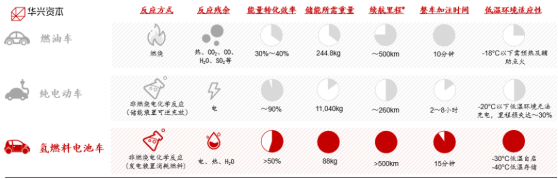 交通领域,氢燃料电池车是目前氢能最为主流的应用。与燃油车相比,氢燃料电池能量转化效率高,运行中零排放,为交通场景提供了重要的减排方案。而与其他新能源车相比,氢的热值高,因此氢燃料电池较锂电池重量轻,同时氢燃料电池续航里程更长、加注时间更短,没有电动车的里程焦虑,用于长途重卡能发挥显著优势。