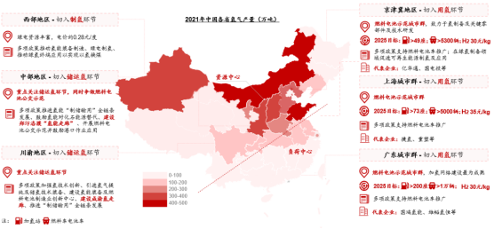 中国自2021年起加速氢能全产业链建设,国务院首次明确氢能在实现碳达峰、碳中和目标中的战略地位,统筹推进“制储输用”全产业链发展。2022年,国家发展改革委、国家能源局联合印发了《氢能产业发展中长期规划(2021-2035年)》,确立氢能是未来国家能源体系的重要组成部分,也是用能终端实现绿色低碳转型的重要载体,《规划》作为我国首个氢能产业的中长期规划,对产业的整体发展做出了顶层设计,联合循序加码的各类国家层面细化政策为各省市的具体规划提供了方向性乃至量化指引(比如氢燃料电池车数量、加氢站数量等)。