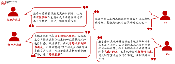 我们也深入访谈了市场中不同背景的投资人,就氢能未来的发展确定性、发展路径以及投资逻辑进行了讨论: