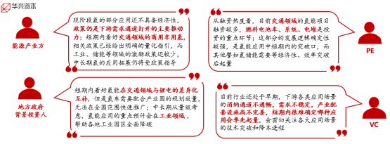 投资人普遍认为未来的能源结构重在多能互补,在各类应用场景不存在“谁必将替代谁”的绝对逻辑,但未来氢能的综合化应用前景已经成为市场共识。短期内,政策主要以交通领域应用为抓手扶持氢能产业链,氢能在交通领域尤其是重卡、船舶等环节会得到快速渗透,有望率先实现商业化。中长期各类投资人对于氢的各类应用场景的研判各不相同,但是政策指引和经济性是判断的主要决定因素。