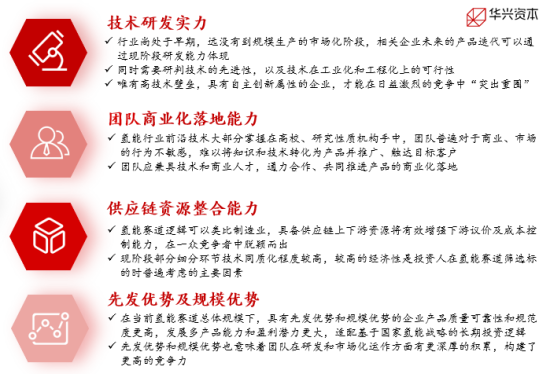 综合来看,氢能可以类比制造业,供应链资源整合和降本能力是目前已经步入产业化阶段的技术路线的相关企业的核心竞争力。同时,因为赛道尚处于早期阶段,技术研发能力和商业化进程是投资人重点考量的因素。