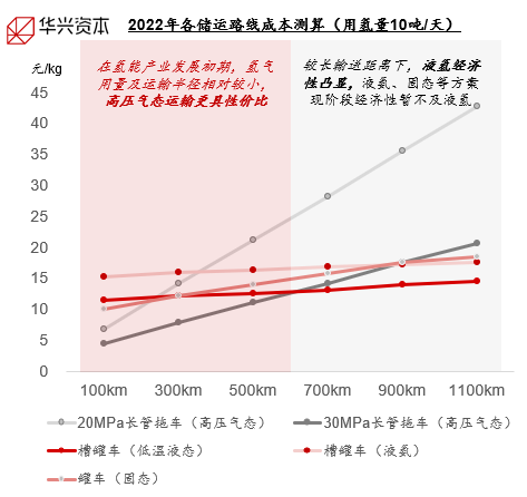 除了技术本身以及产业化进程层面的差异,不同输送距离下各储运方案也呈现出明显的经济性差异,比如在500km以内的短距离运输场景中高压气态的方案最为经济,且随着压力的提升,效率变高的同时成本也越低,而大于500km的中长距离,高压气态的成本将大幅上升,液氢则成本更低。因此,未来基于技术突破、规模化应用,短距离高压气态储运有望持续降本,远距离输送方案亦将具备经济性,构建千亿级氢能储运市场。同时,如何配合氢能整体产业链的规?;⒄菇碳笆庇行У胤⒄共煌那獯⒃思际趼废咭彩悄壳叭得媪俚奶粽健?/p>