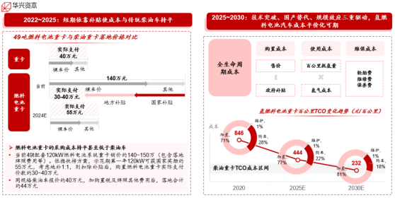 抛开技术不谈,我国的燃料电池产业的商业逻辑是量和价的正反馈。政策率先推动燃料电池的装机量上涨,大规模放量又推动成本下降,直到燃料电池在重卡领域的全生命周期成本与传统燃油重卡相比具备竞争力就不需要补贴,而是依靠自发性需求驱动市场化的竞争。需求带动量接着上升,再进一步带来成本的下降,量价不断的循环持续推动市场增长。经测算,2025年之前在补贴的支持下氢燃料电池重卡的购置成本可与柴油重卡持平,补贴退坡后,2030年氢燃料电池汽车成本可实现平价化。