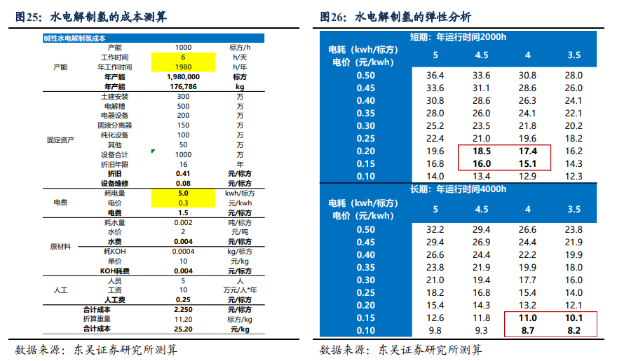 理想情况下,按照电耗4kwh/标方,电价0.15元/kwh,对应成本为15元/kg,则基本可与天然气制氢平价;