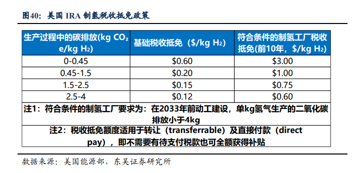 东吴证券表示:对于2033年以前开始建设的制氢项目,项目运营的前10年将获得5倍的税收抵免额度,即0.6-3美元/kg氢气,绿氢可享受3美元/kg补贴,且10年后将继续受益0.12-0.6美元/kg的标准税收抵免额度。抵免将通过直接补贴的形式发放,且税收抵免额度可以转让,这使得无税收的公司亦可获得直接收益。