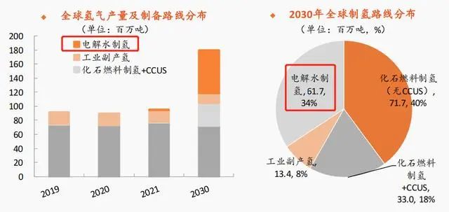 随着制氢成本下降,国际能源署预测,到2030年,全球氢气产量将达到1.8亿吨,较2021年的0.94亿吨翻倍增长。其中,电解水制氢产量将从2021年的不到4万吨大幅增长至6170万吨,清洁制氢方案将成为主流。