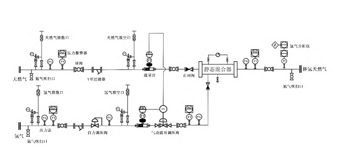 虽然掺氢天然气管输系统与天然气管输系统类似,但掺氢后的管输系统与原管输系统的技术特点有4点不同:①掺氢比。掺氢比的确定尚无统一标准,目前只有针对天然气输送和城镇燃气气质要求中有对氢气含量的相关规定。在国家“十四·五”重点研发计划“氢能技术”重点专项中,掺氢管道输送重点研究的掺氢比为5%~20%(体积分数)。未来应进一步明确不同制约条件下掺氢比的确定标准。②管材及关键设备相容性。由于天然气管道输送系统的管材、压缩机、流量计、调压阀等在选型时主要针对天然气,掺氢时需重新评估管材、关键设备及部件在临氢环境下的适应性。对于管材,掺氢管道临氢环境下的相容性评价仍是研究难点。对于管道关键设备,掺氢条件下压缩机的喘振、阻塞边界、特性曲线不明晰,压缩机的安全掺氢比和输送工况适应范围等仍待深入研究。掺氢还会对管道系统中流量计的计量精度、调压阀的流通能力、密封圈的密封性能等产生影响,未来需发展掺氢条件下流量计的精度校正方法,形成调压阀运行参数校正方法,建立法兰密封面处的掺氢天然气泄漏模型。③掺氢工艺及设备。为保证掺氢天然气利用的稳定性和安全性,需严格控制天然气中氢气的掺混比例和掺混均匀度,因此,掺氢天然气管道输送系统一般设置掺氢混气站。为了适应终端用气量的变化,目前普遍采用随动流量掺氢工艺(图1)。静态混合器是随动流量掺氢设备中氢气和天然气掺混的主要场所,《天然气掺氢混气站技术规程》中规定天然气和氢气的掺混均匀度应不小于95%。随动流量掺氢精度的调控是关键,现有随动流量掺氢设备一般先人工初设掺氢比,然后在混气路上采用氢分仪或色谱仪检测氢组分浓度,将氢组分浓度反馈到控制系统并调节氢气路的流量,《天然气掺氢混气站技术规程》中规定掺氢比的调控精度应不大于±1.5%。④氢分离技术及设备。掺氢天然气除了直接燃烧利用,还可分离提纯后利用纯氢,需发展适用于掺氢天然气管道输送系统的氢气分离提纯技术。现有氢气分离提纯技术主要有变压吸附法、膜分离法、低温分离法、电化学分离法等,面临的主要问题是高压力、大流量、低掺氢比下高纯氢分离提纯效率低、回收率低、成本高。未来需发展高性能膜材料、抗毒化抗粉化高性能吸附剂材料等,探索可获得高纯度、高回收率的低成本分离工艺,研制高压大流量低掺氢比分离设备。
