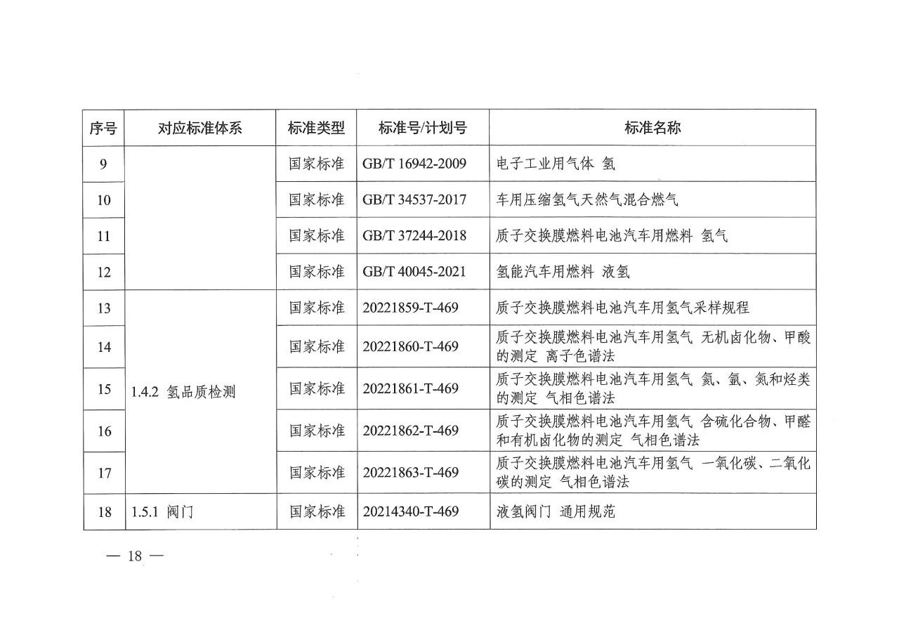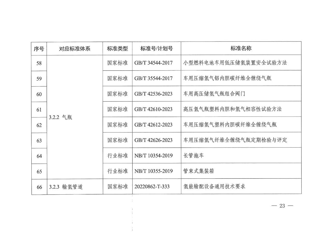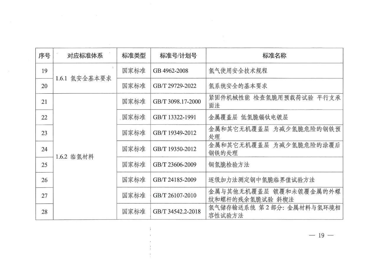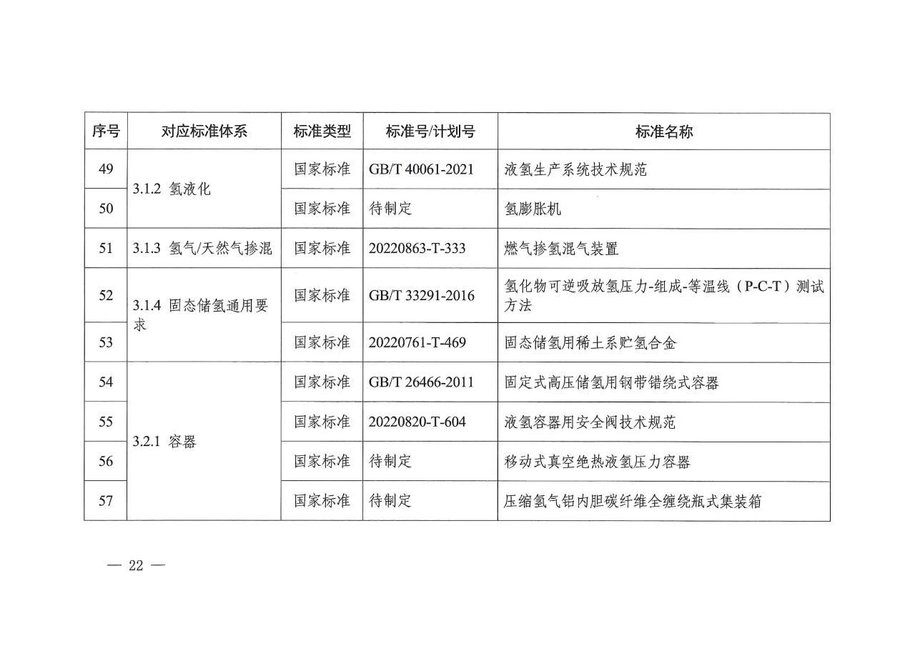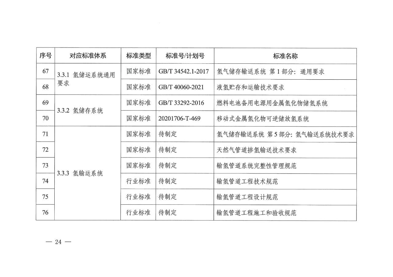 在氢储存和输运方面,主要包括氢气压缩、氢液化、氢气与天然气掺混、固态储氢材料等氢储运基本要求,容器、气瓶、管道等氢储运设备以及氢储存输运系统等方面的标准,推动安全、高效氢储运相关标准的制修订。