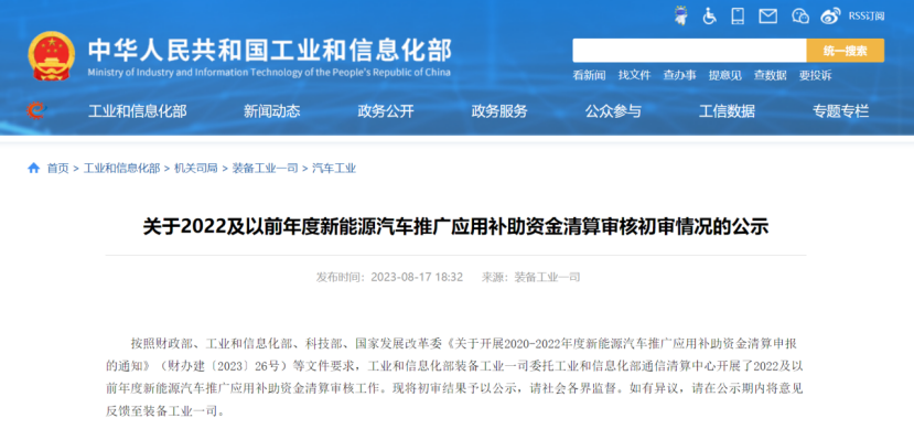 8月17日,按照财政部、工业和信息化部、科技部、国家发展改革委《关于开展2020—2022年度新能源汽车推广应用补助资金清算申报的通知》(财办建〔2023〕26号)等文件要求,工信部发布了关于2022及以前年度新能源汽车推广应用补助资金清算审核初审情况的公示。