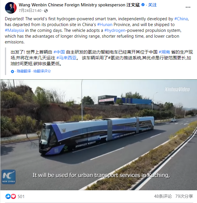 作为全球首辆氢能源智轨电车,中车智轨出口到马来西亚是备受关注,今年8月,中国外交部新闻司副司长、发言人汪文斌在其Facebook发布了全球首辆氢能源智轨电车出海视频并配文点赞,向全球网友推介中车智轨。