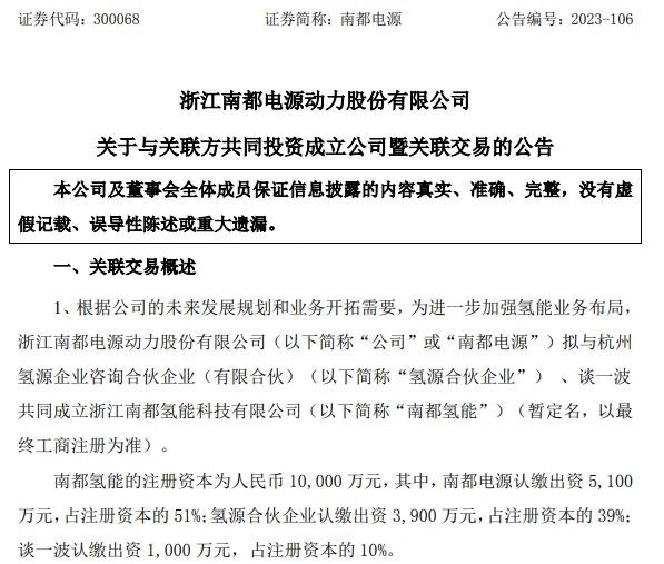 10月25日,南都电源公告称,为进一步加强氢能业务布局,公司拟与杭州氢源企业咨询合伙企业(有限合伙)(以下简称“氢源合伙企业”) 、谈一波共同成立浙江南都氢能科技有限公司(以下简称“南都氢能”)。