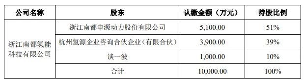 公告显示,本次南都氢能的注册资本为人民币10,000万元,其中,南都电源认缴出资 5,100万元,占注册资本的 51%;氢源合伙企业认缴出资3,900万元,占注册资本的39%;谈一波认缴出资1,000万元,占注册资本的10%。
