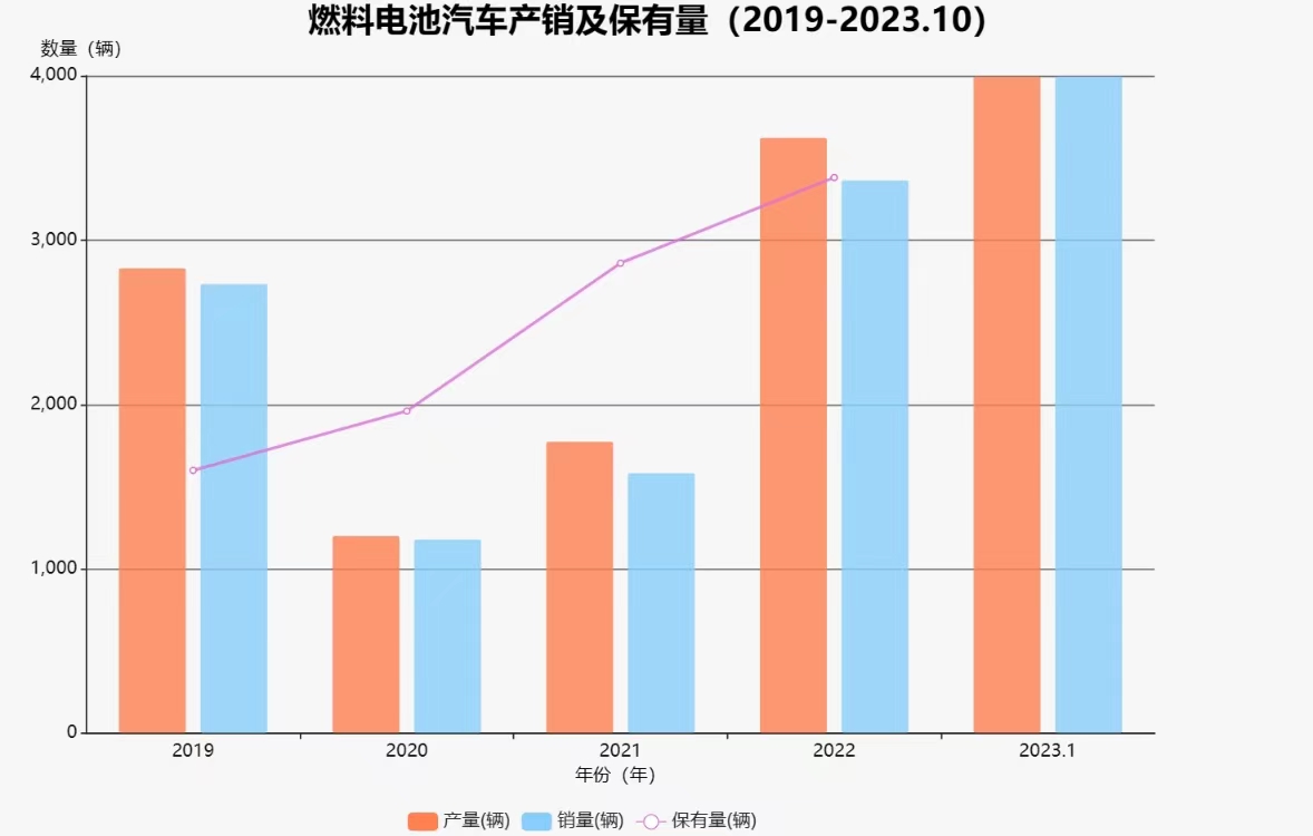2022年,全国燃料电池汽车产销分别达到3628辆、3367辆,相比2021年同期分别增长105.4%和112.8%;截至2022年底,全国燃料电池汽车累计销售1.2万辆。
