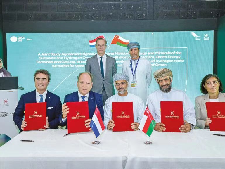 近日,在迪拜举行的第28届联合国气候变化大会期间,阿曼能矿部与阿曼国家氢能公司(Hydrom)、荷兰阿姆斯特丹港、真力时能源通道公司(Zenith Energy Terminals)及 GasLog 公司签署一项联合研究协议(JSA),合作为阿曼绿氢出口开发一条液氢运输线路。