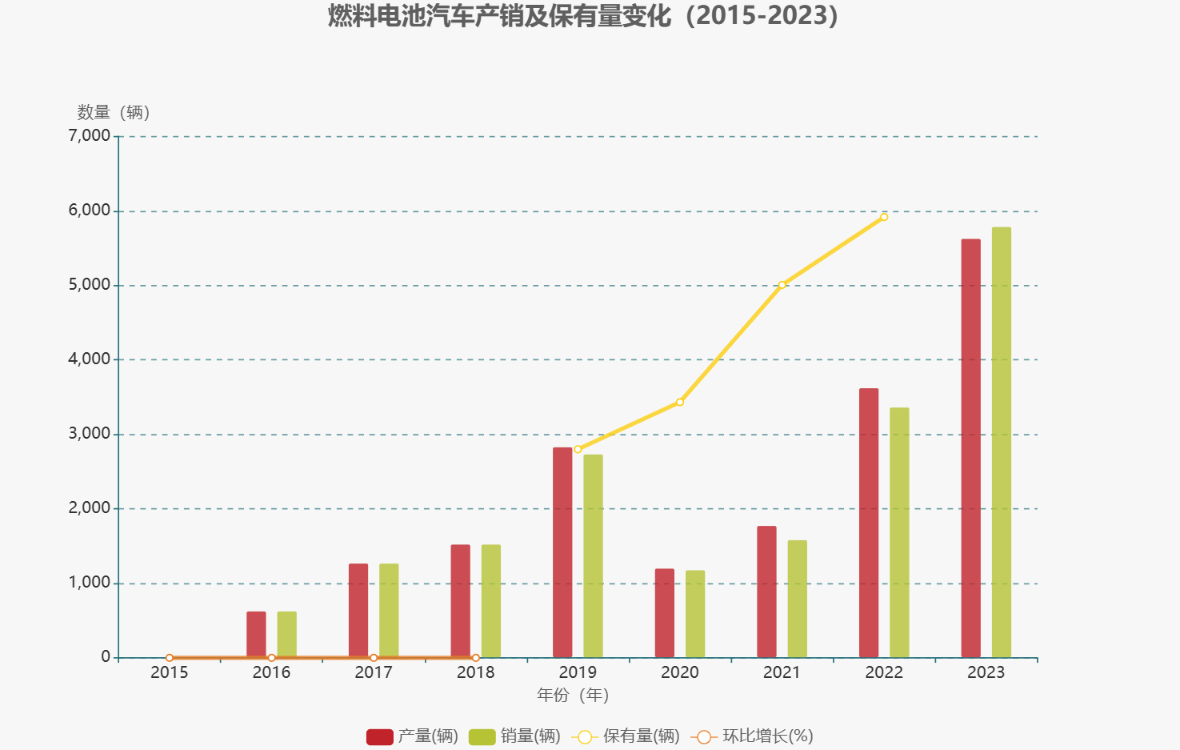 我国氢燃料电池车从2017年底的50辆增长到2022年的12682辆,5年时间增长了253倍。