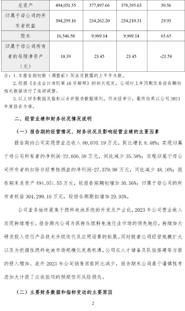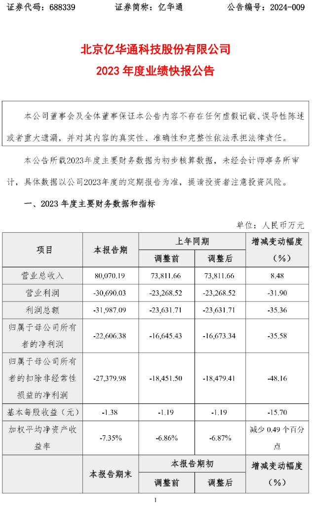 公告指出,亿华通2023年度营业总收入为80070.19万元,同比增长8.48%,实现归属于母公司所有者的净利润 -22606.38 万元,同比减少35.58%。