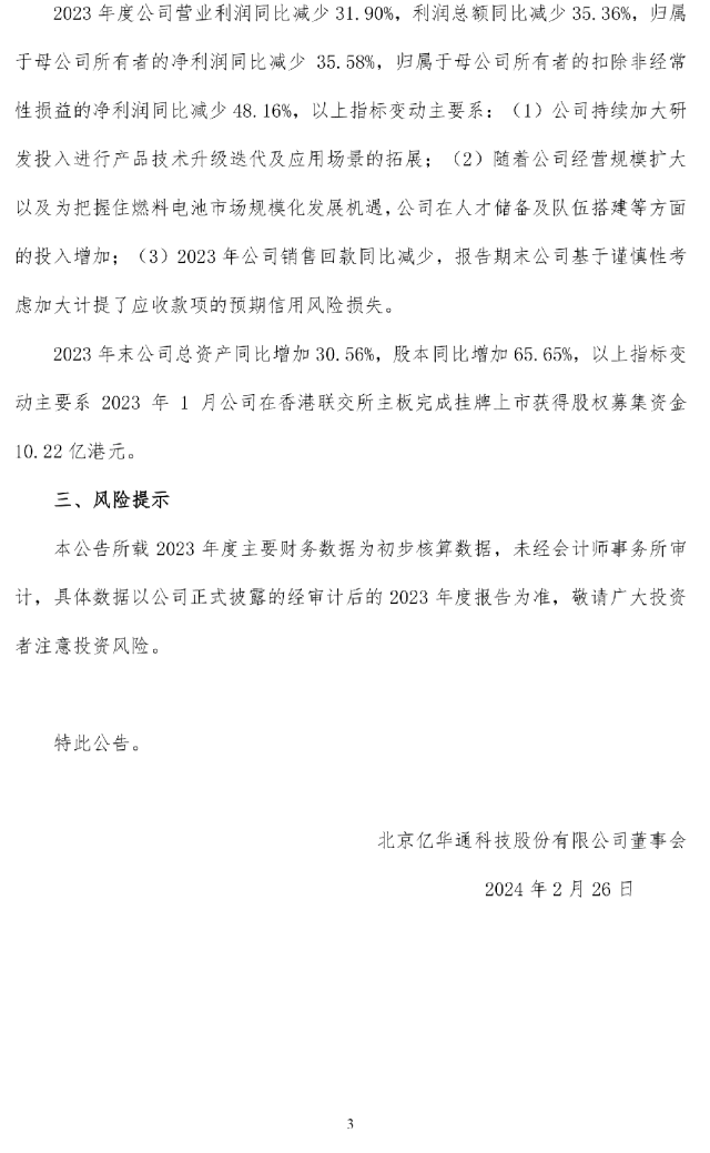 2月26日,亿华通发布2023年度业绩快报公告。