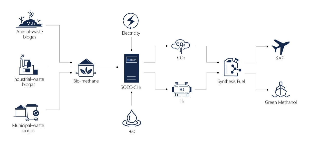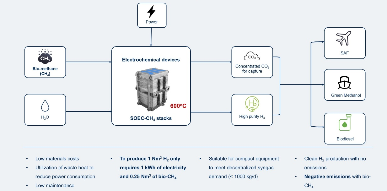 采用更先进的电化学路线,将生物天然气、绿电、水输入电堆,在600℃运行温度下,同时产出高纯度绿氢和自富集的CO2,一次性解决绿色燃料合成时的两大重点原料的来源问题。