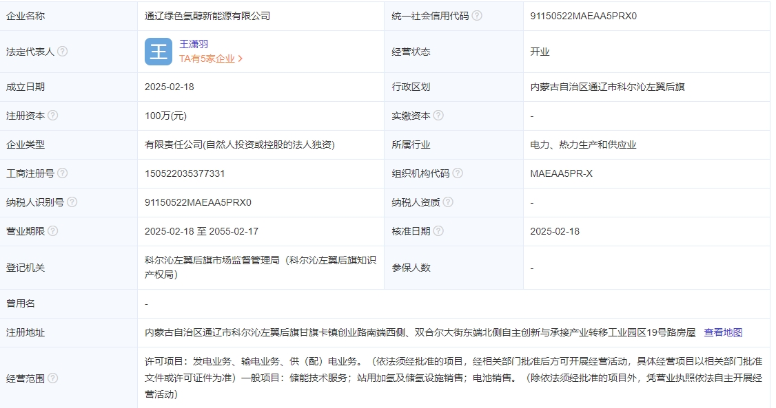 近日,通辽绿色氢醇新能源有限公司成立,注册资本100万元,经营范围:储能技术服务;站用加氢及储氢设施销售;电池销售等,该公司由中能建氢能源有限公司全资控股。
