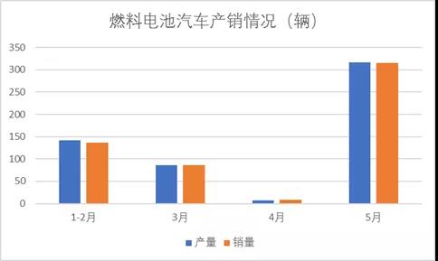 燃料电池汽车方面,中汽协并没有公布2019年1月份和2月份的燃料电池汽车具体产销数据,但根据数据推算,1-2月产销总量分布是142辆和137辆,3月份产销均完成86辆,4月份产销分别完成9辆和7辆,5月份则产销分别完成316辆和315辆,产销数量波动较大,原因是氢燃料电池汽车仍主要依赖政府采购,同时厂家有意控制产量。