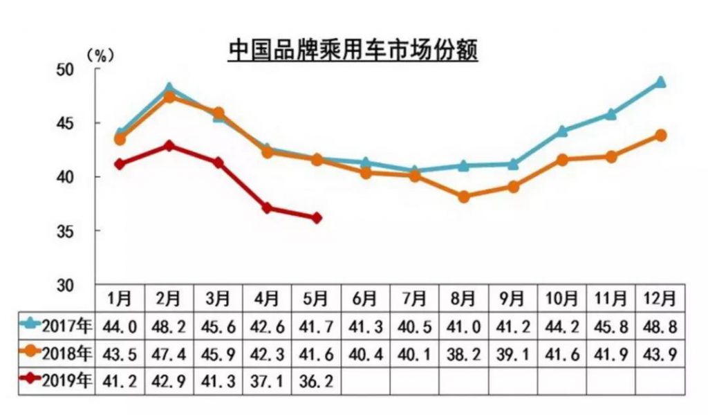 自主品牌市场占有率自2013年以来再次跌破40%红线。在车市寒冬下合资品牌价格大幅下探,挤压自主品牌生存空间成为重要原因。另外值得注意的是,在自主品牌一直领先的SUV市场,其市场占有率在5月也跌破了50%,合资品牌在全方面向自主品牌施加压力。车市寒冬之下,不知自主品牌能否挺过难关?