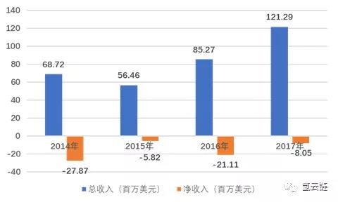 上面仅是定性分析。我们再看一下巴拉德各年收入和利润变化趋势。如图3所示,截至2017年末,巴拉德还处于亏钱状态。“行业收入逐年递增,利润亏损逐渐收窄”符合高科技产业早期阶段财务特征。2017年收入为12128.8万美元,说明全球市场对燃料电池技术和设备的投入拐点出现。