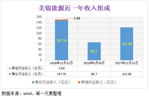 从上图可以看出,美锦能源近一年来主要收入源于焦化行业,其收入占到了总收入的97.56%,2017年更是达到100%。