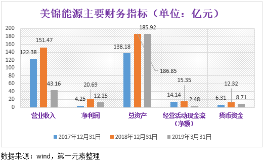 通过以上数据表可得知,2018年美锦能源总收入为151.47亿元,净利润仅为20.69亿元,货币资金截至到2019第一季度仅为8.71亿元,总资产总计为185.92亿元(低于200亿元),因此从美锦能源自身的财务实力来看,很难支撑其200亿元巨大的氢能项目投资。