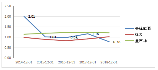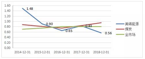 如图1及图2所示,美锦能源的流动比率0.78,速动比率0.56,均弱于煤炭行业整体水平。表明其短期债务偿还能力表现一般,不可能再进一步增加短期债务。